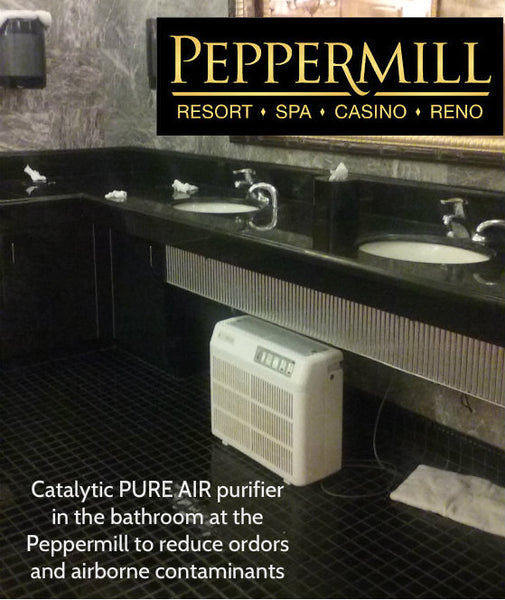 Peppermill Resort Spa Casino use Catalytic PURE AIR purifiers in their bathrooms to reduce odors and improve indoor air quality 24/7.  The PCO (photo catalytic oxidation) technology omits no ozone so the air purifier can work 24/7 with guests and employees in the bathroom. At a daily cost of $1.59, the Catalytic PURE AIR purifier keeps your bathrooms cleaner and healthier. For more information see BetterAirToday.com or jim@catalyticpureair.com